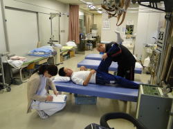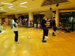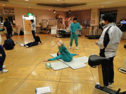 呉共済病院の広い体育館を 全面使ってのトレーニング★ 井上トレーナーの 的確な指導を、 整った環境のなかで 十分に受ける事が出来ます。 |