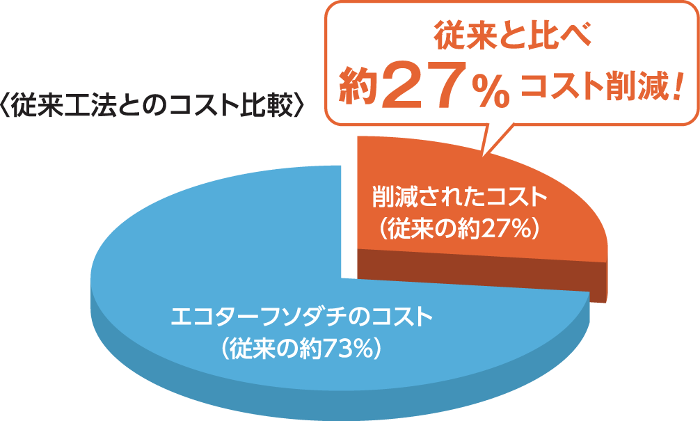 ※下記のグラフは、従来工法のコストを100%とした場合の比較。従来工法とは張り芝工法